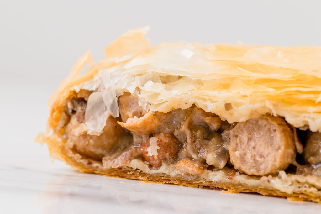 Filodeeg – vol au vent (kip, kippengehaktbal, champignons, uien) – verse room