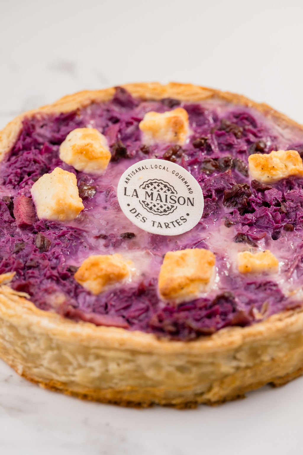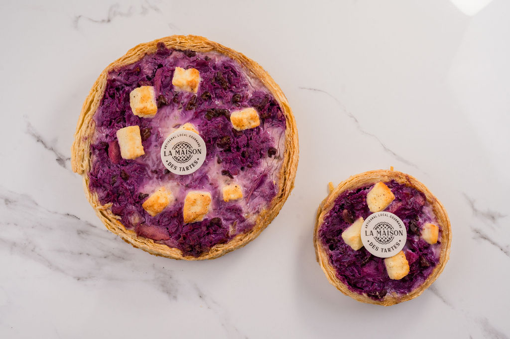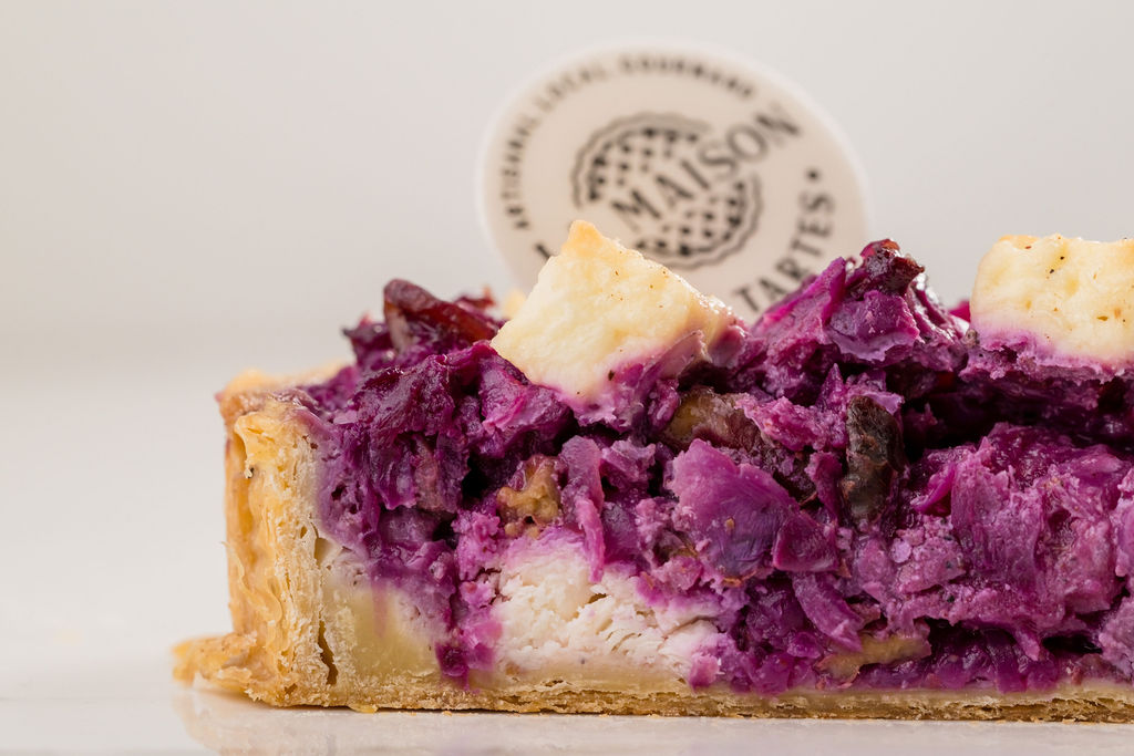 Pâte feuilletée – chou rouge – feta – pomme – noix – composition (lait, œufs, crème)