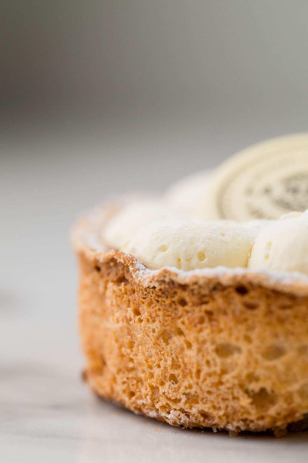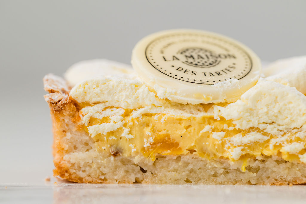 Dacquoise aux amandes – compotée de mangue – crème aux fruits de la passion et à la vanille de Madagascar